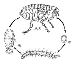 跳蚤为完全变态昆虫,整个生活史分卵、幼虫、蛹和成虫四个时期,各个时期的形态完全不同。成虫体型微小或小型,无翅,体坚硬侧扁;幼虫无足呈圆柱形,营自由生活,具咀嚼式口器,以成虫血便或有机物质为食。